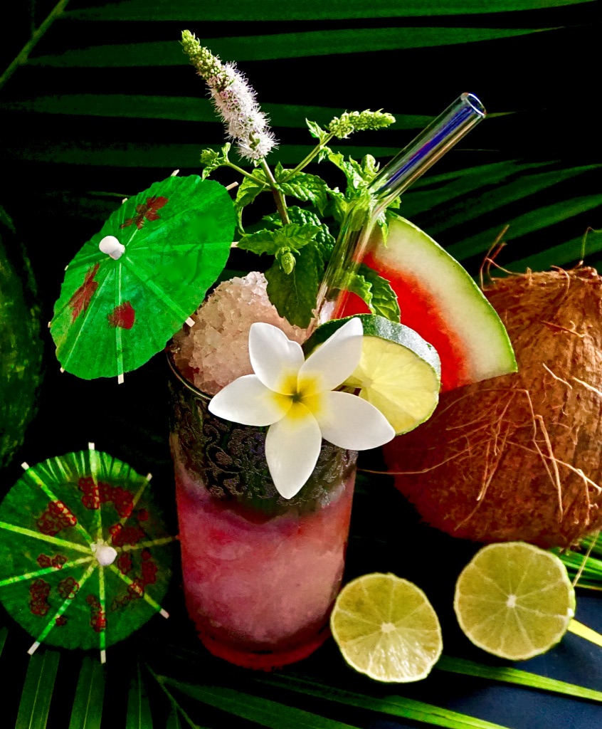 Honor the Tiki gods with gorgeous garnishes! Since we begin enjoying foods and drinks with our eyes, first, I recommend enhancing your presentation with mostly edible garnishes, which reflect the ingredients of the recipe. Think of garnishes as a tempting preview of what’s in the glass. Based on this recipe, a glass-sized watermelon wedge, lime wheel, and bountiful mint sprigs (bonus if your mint is flowering) are the most obvious, and readily available choices. While, I haven’t tried it, even the plumeria blossom, or frangipani flower (which happen to grow in my yard) is edible. Just be sure not to include the green, milky stem or leaves, which are toxic. The only non-edible garnish is the paper umbrella, and is a nostalgic nod to Tiki culture. Oh, and be sure to use a reusable straw of glass, metal, or silicone, because keeping our beaches and oceans clean will surely please the Tiki gods.