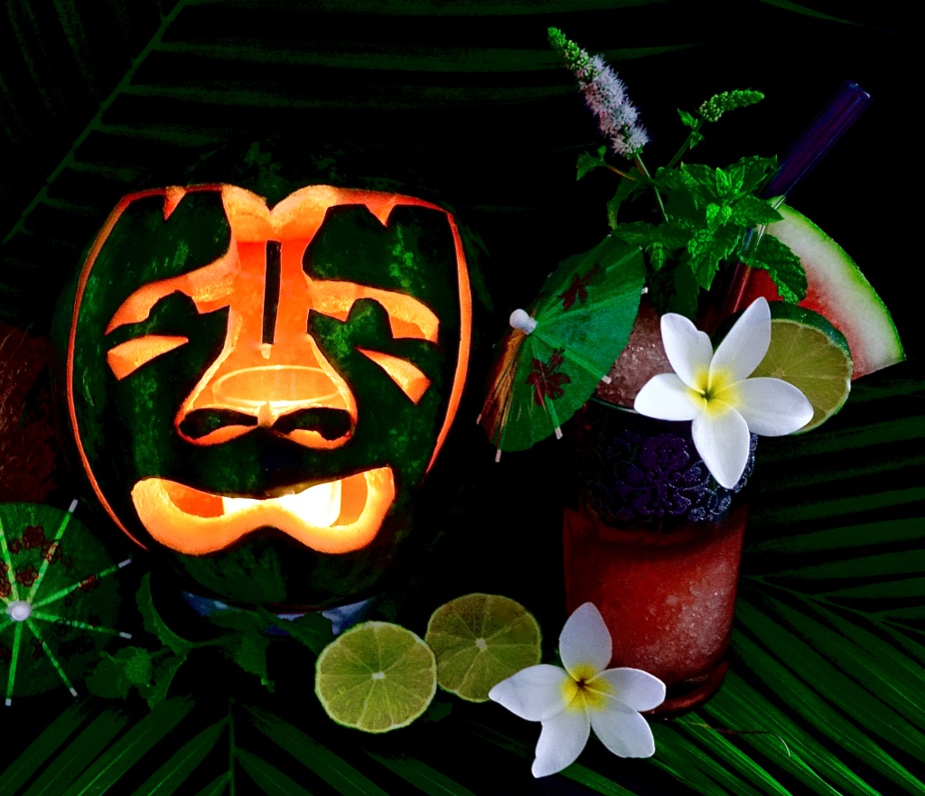 My spooky Luau Lovers, I implore you to carve your Creepy Tiki Jack O’ Melon before partaking in the party known as ” ‘O Ka Make on Vaycay “. Don your grass skirt, and hula ’til your Hawaiian heart’s content. Feel the cool sea breeze in your hair, and huddle in a hut with your honey. ” ‘O Ka Make on Vaycay ” is an escape to paradise — but a spooky one, of course!