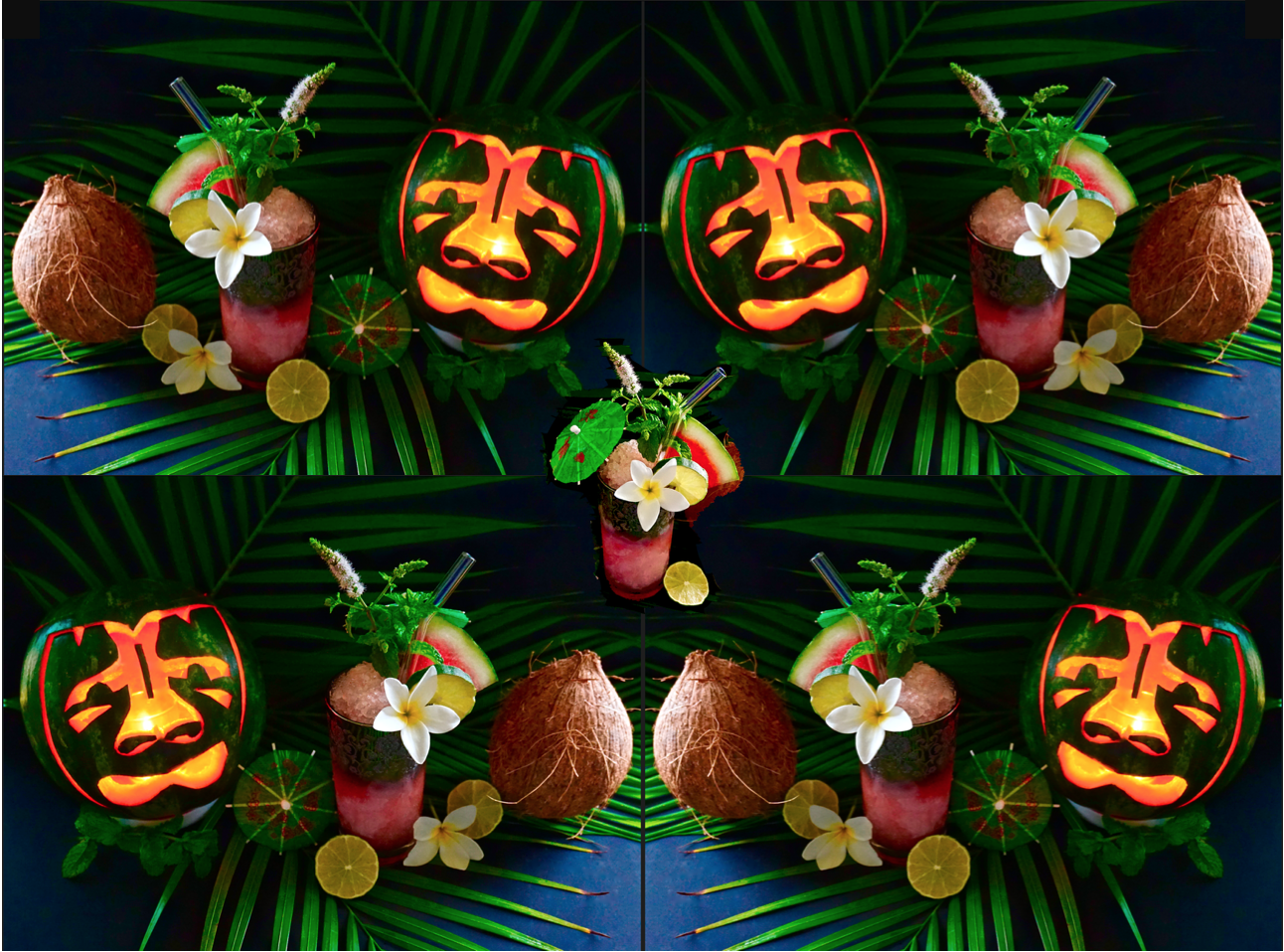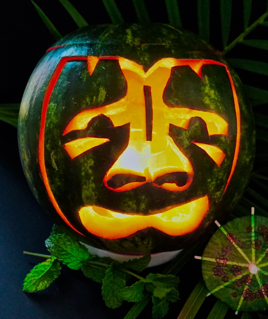 No matter what you name it, Watermelon, Summer Pumpkin, or Jack O’ Melon, this green freak of a fruit makes one hell of a Tiki Cocktail! And, due to the presence of absinthe, among all of the tropical flavors, I thought the name ” ‘O Ka Make on Vaycay “, (‘O ka make is Hawaiian for DEATH) was well-suited for this summer sipper.