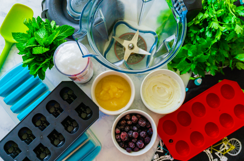 All you need to tame the “funk of 40 thousand years” is a blender, ice cube trays, coconut oil, organic Greek yogurt, unsweetened apple sauce, fresh parsley, fresh mint, and frozen blueberries.