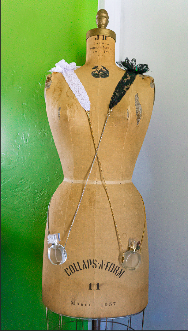 Of course, Pretty Spooky Purifying Potion Atomizers can be worn as a long necklace by joining the two lobster clasps of the 30 inch chain together. Or, ribbon can be measured to the perfect length to create a continuous band of fabric to connect to the lobster claws and convert the necklace into a cross-body application.