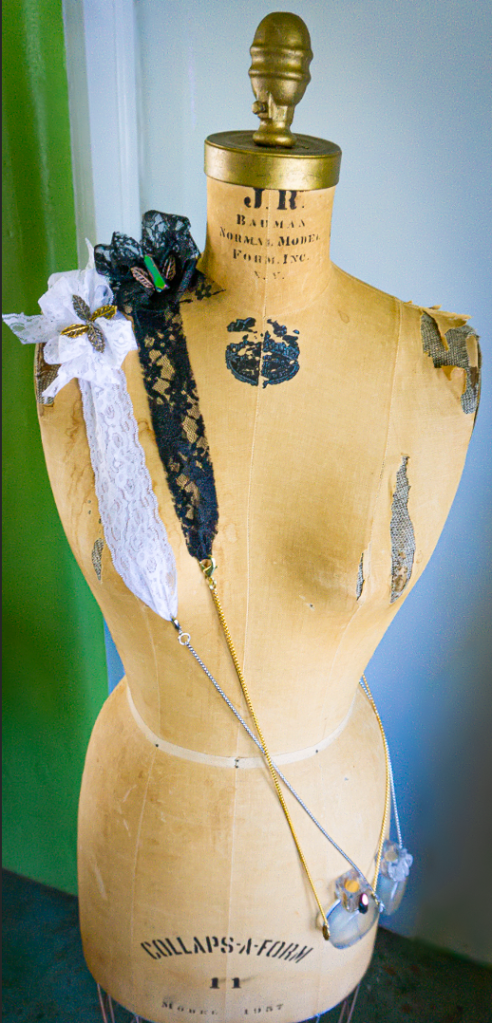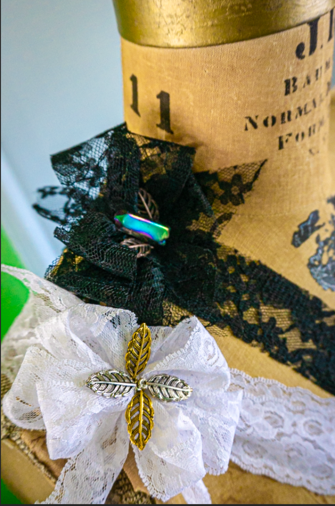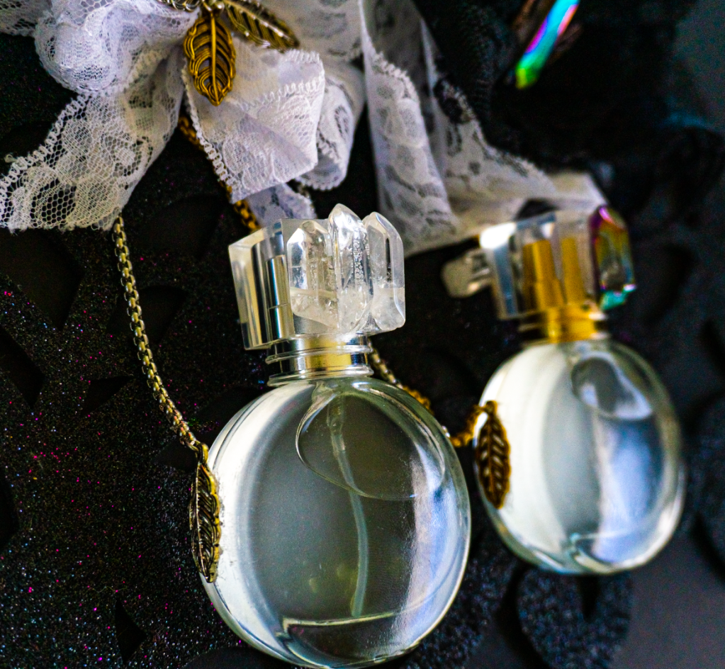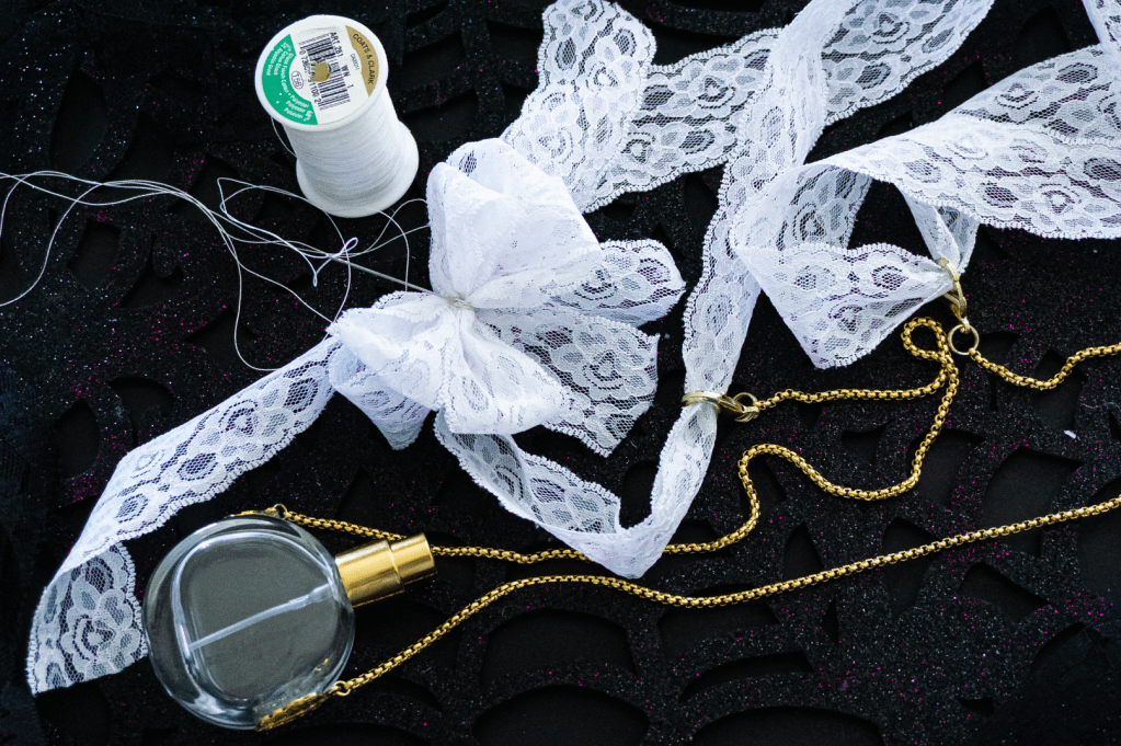 I knew that I needed a better potion– and I’d need it in a convenient, pretty, wearable, potion bottle. I also knew that I’d need versatility. My wardrobe requires both a gold and a silver version, as well as a necklace-length version and a cross-body style. Therefore, I ordered two, one-ounce perfume bottles (one with gold-tone hardware and one with silver-tone accents) and two 30 inch stainless steel chains to match. I found the jump rings, lobster-claw clasps, metallic leaf charms, crystal-shaped beads, glass & metal craft glue, and lace ribbon (in black and white) at my local craft store. I needed to make these bottles practical for daily use and aesthetically pleasing — even from six feet away.