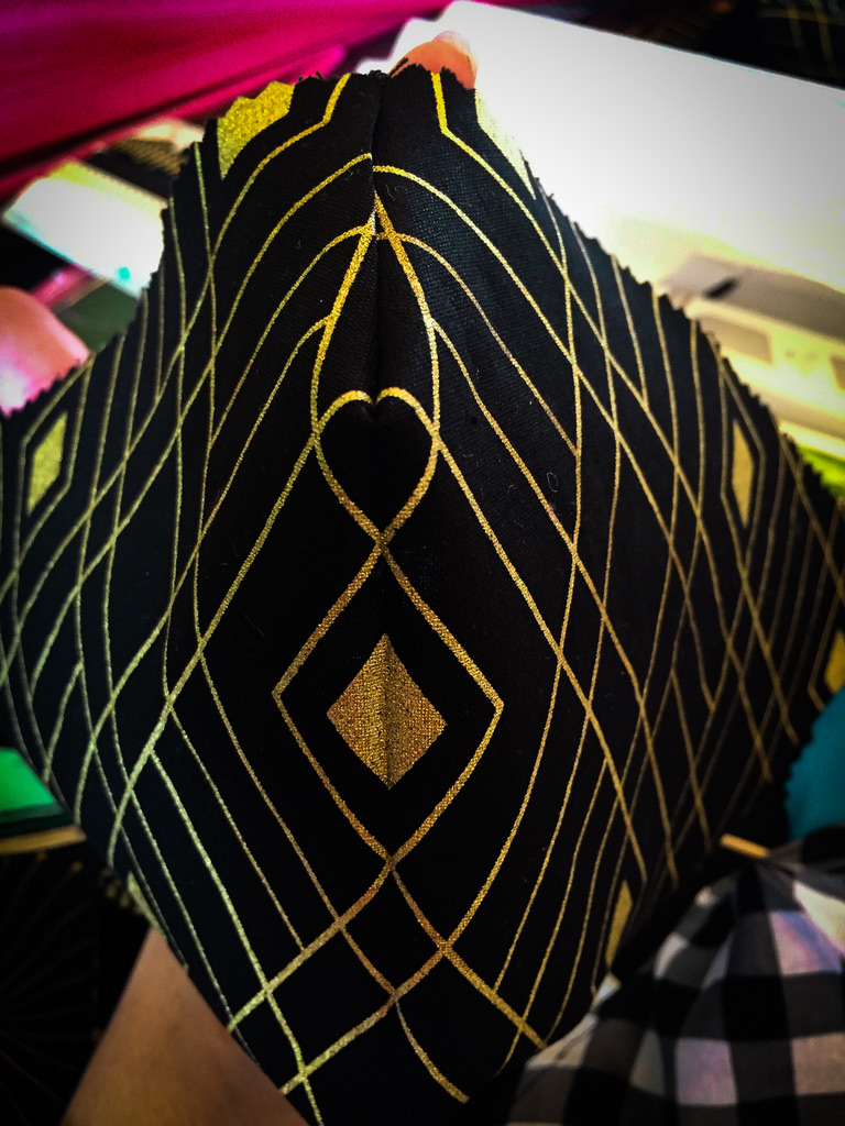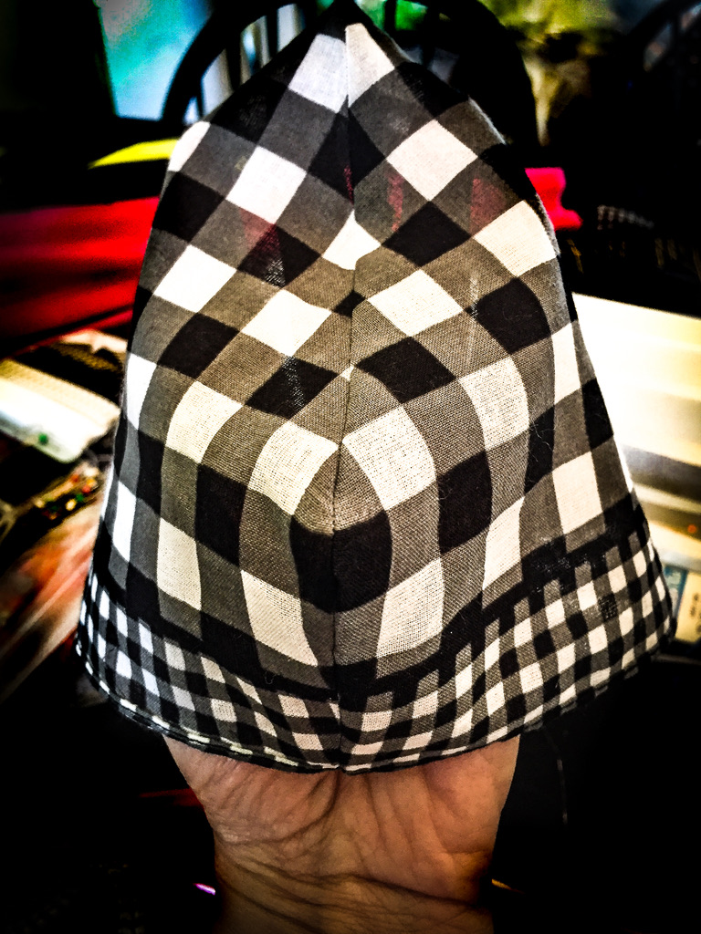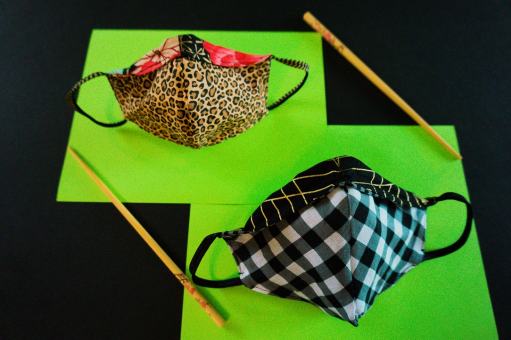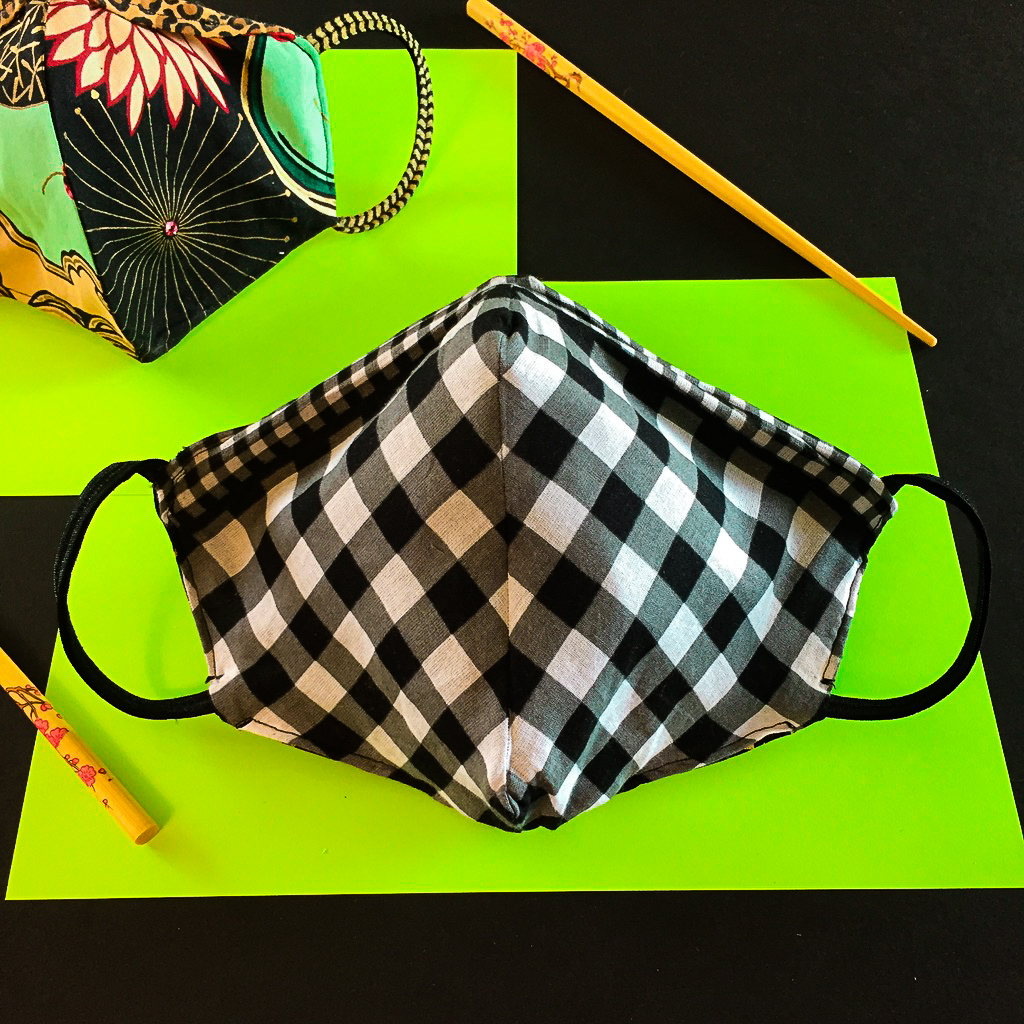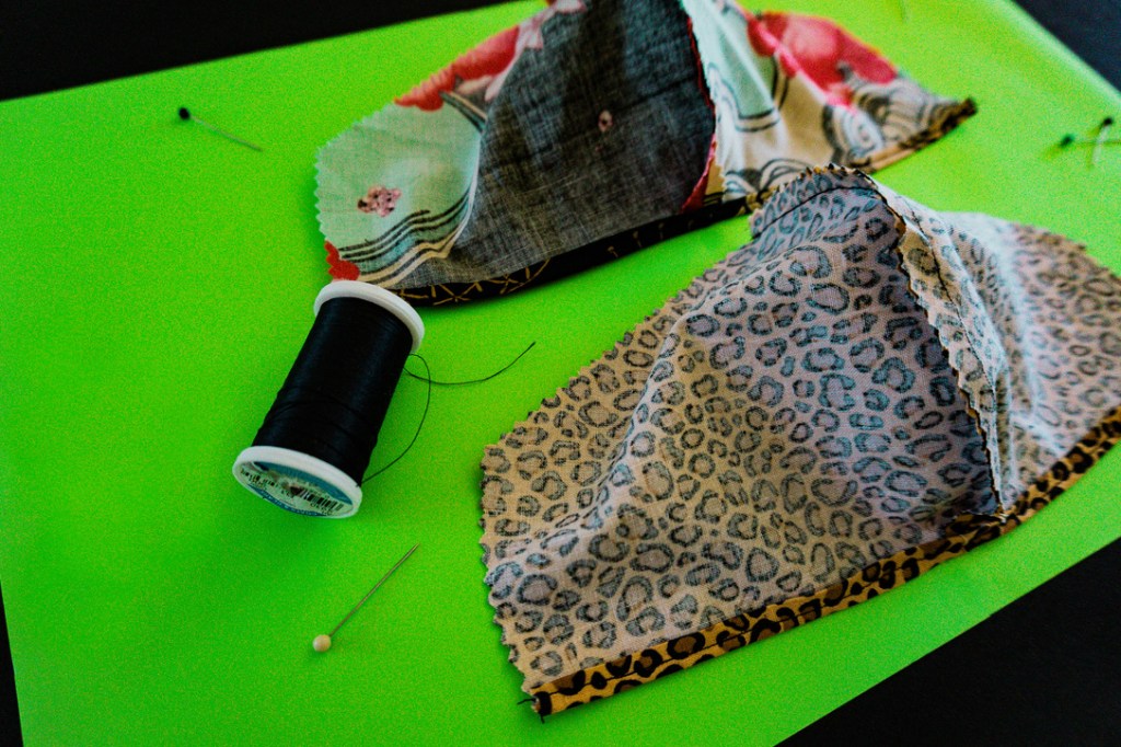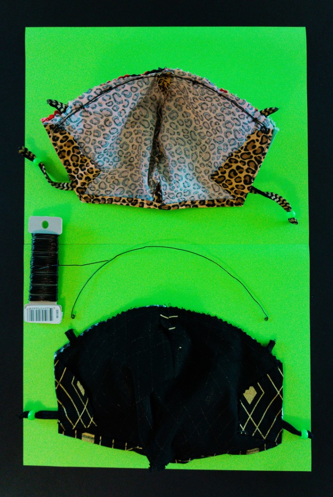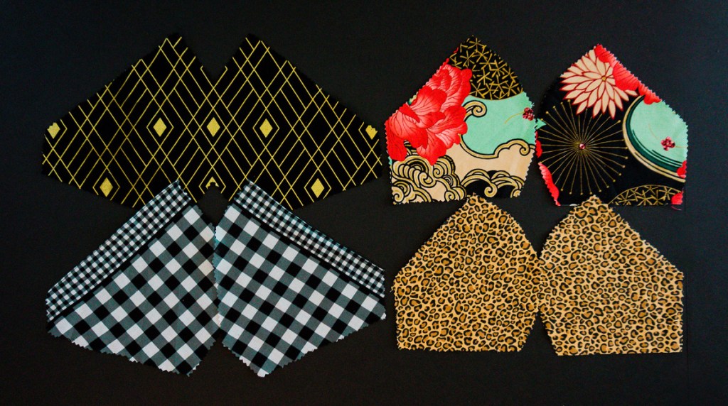 Depending on the symmetry or simplicity of your print, the angular mask can be folded and cut as a single piece, like the gold and black fabric on the top, left. But, in order to retain the mini-checked boarder, while realigning the larger checks, it was necessary to cut two, separate pieces on the bottom, left. And, for the curved design, it’s important to take the print into consideration, especially since it is four, separate pieces. It took a couple tries to incorporate the correct balance of color and graphics with such a large, busy motif on the top, right. And, if you want something as easy as being a ghost in a sheet shop, go for tiny, randomly repeating prints, like leopard.