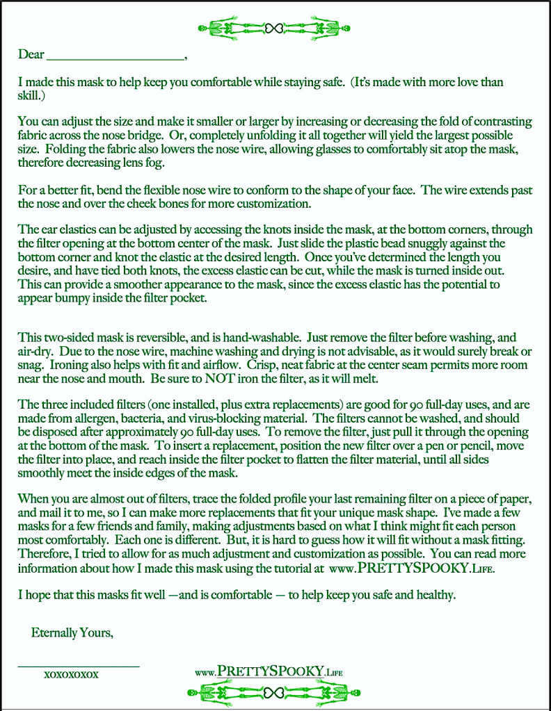 When making masks for friends or family, I slip the mask, with its installed filter, plus a few replacement filters in a zipper bag, and include the following, printable note of explanation: