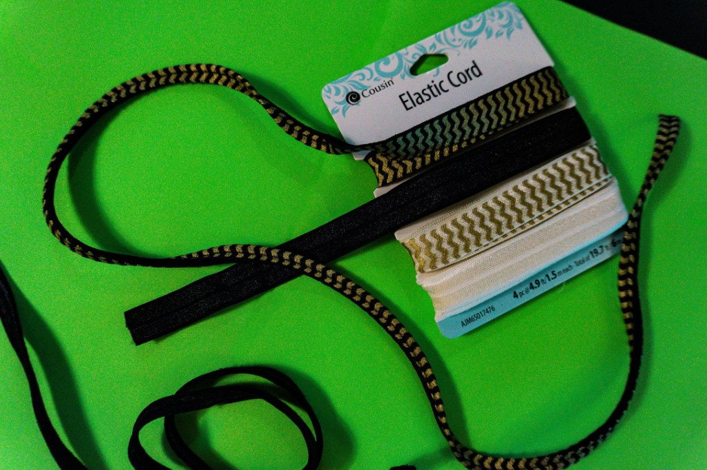 Because no one likes the horrible hair crease that an elastic band leaves, ear elastics are the only fashionable option. While earning style points, ear elastics can be lacking in the comfort department. However, I found an elastic, printed ribbon in the craft section of the big box store, which is softer and more comfortable, even when the elastic is sewn double to make it thinner to fit over the ear.