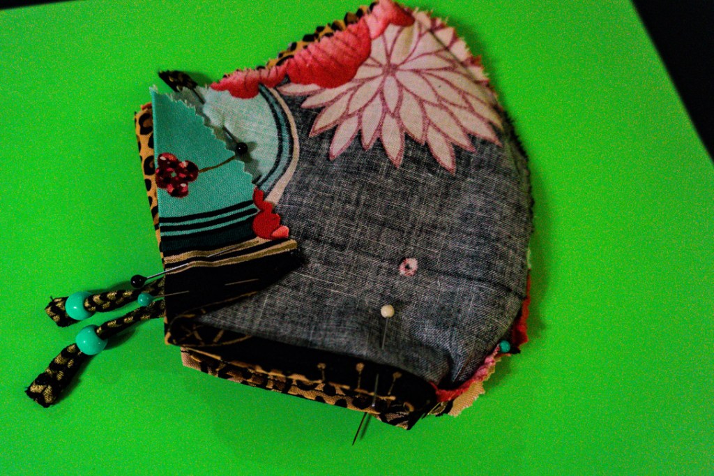 Firmly pin the ear elastics, at a slight angle, where the the top seam will secure the upper portion of the ear loop, ensuring that the elastics will slant smoothy upward and outward, when turned right-side out. However, at this point, the elastic loops are still “inside” the inside out mask. Fold the tailpiece of the elastic twice, and hand-stitch a flat, finished end to retain the adjustment bead. With the pinned side down (because I learned that cleaning colorful streaks of melted, plastic pin tops off the iron isn’t as fun as it sounds), press the two, pinned fabrics for smooth, pucker-free seams.