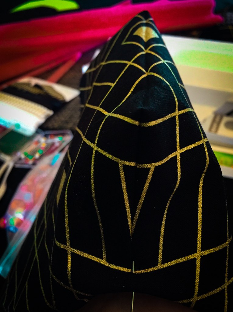 For this mere “Halloween Screamstress” and her fussy old machine, working with breathable cotton fabrics of the same weight and weave was easier and led to less puckering and smoother seams. Keep in mind that the fabric will be doubled, since it is reversible, and there will be a filter inside. So, the fabric should not be heavy or thick.