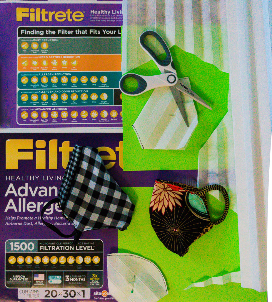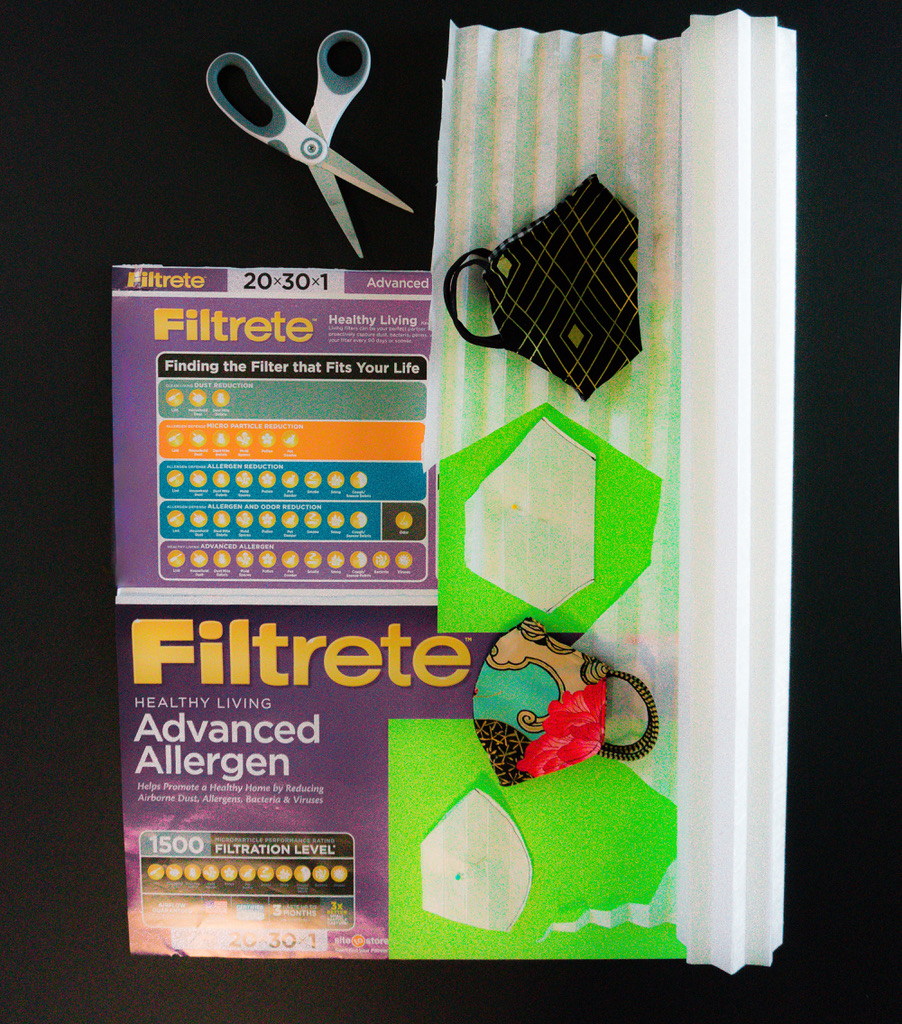 Readily available filter material can be purchased at any of the big box and home improvement stores. Look for an air conditioning filter with a high filtration number, and search for virus filtering capabilities in the description. It is fairly simple to remove the pleated filter material from it’s cardboard frame and wire screen. What remains, when the pleats are flattened, is fortunately much larger than the given dimensions. Filters are typically rated for 90 days of use, and numerous mask filters can be cut from a single AC filtration unit. Furthermore, buying a replacement unit with larger dimensions makes these virus-blocking filters an even better value.