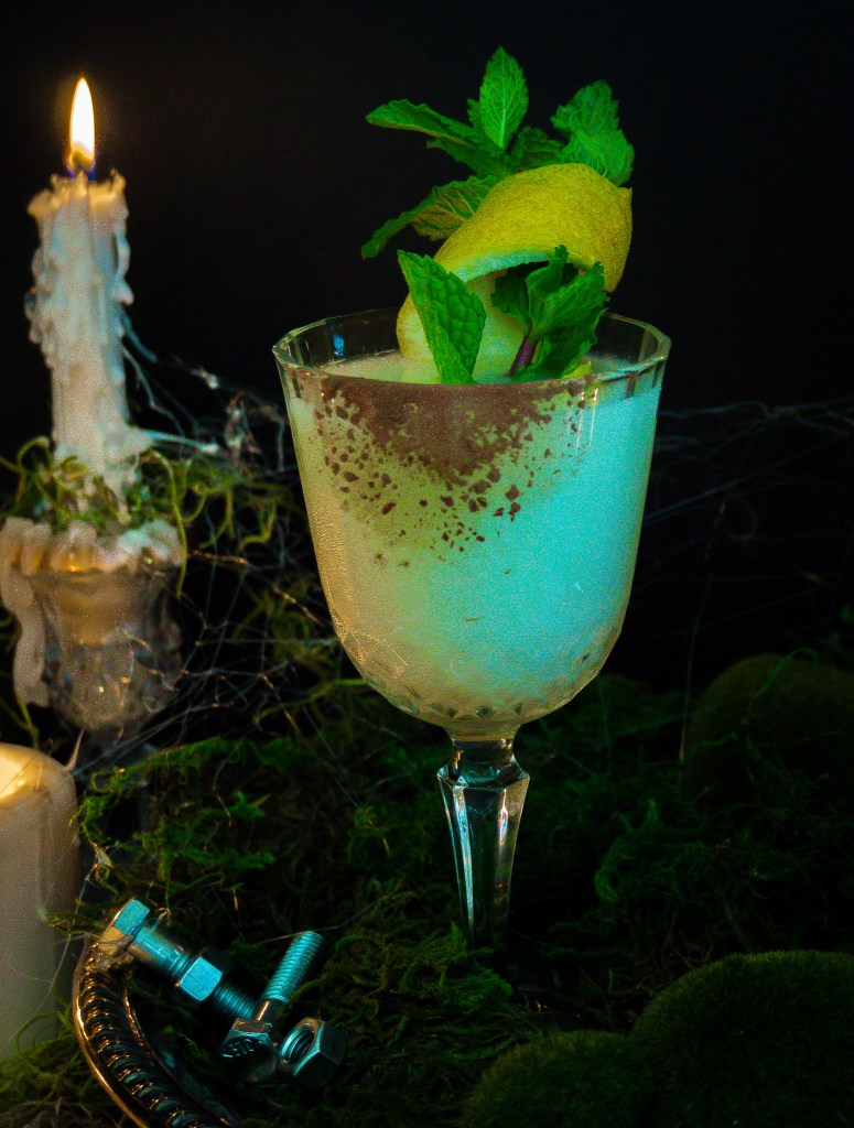 The Herman concoction is smooth, strong, and a little sweet, just like Hermy, himself. Green Chartreuse, an indescribable, sweet, yet powerful, herbal elixir, enhances the velvety notes in Creme de Cocoa. Fresh lemon juice turns up the volume on all the flavors, and the addition of egg white mellows any acidity, which ties together all of the flavors with a texture as silky as coffin lining. It’s a got a ghastly green pallor, and flavors as complex as an explanation of the afterlife, making The Herman a truly lovable libation that will have you exclaiming. “Oh, goody!”, too.